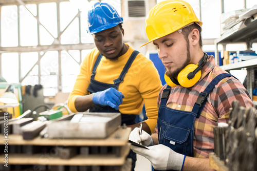 Bearded inspector wearing hardhat and overall taking notes while carrying out quality control at production department of modern plant, African American machine operator answering his questions