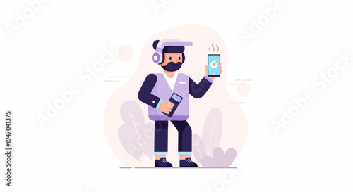 man, male, person, beard, earphones, headset, ear, technology, phone, mobile, smartphone, device, app, screen, display, held, holding, hand, object, item, carrying, electronic, modern, digital, communication, connection, wireless, listening, music, audio, sound, info, datum, graphic, illustration, flat, style, cartoon, character, animated, simple, clean, minimalist, creative, abstract, background, plant, leaf, light