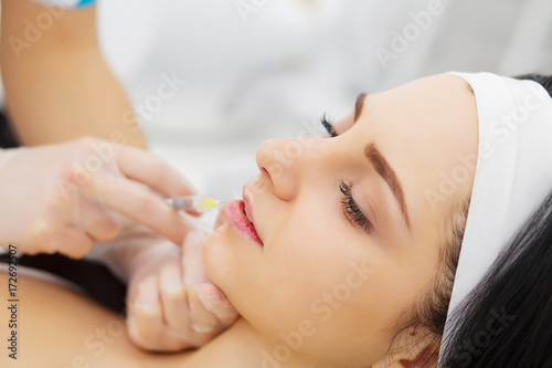 beautician doing beauty injection to woman lips