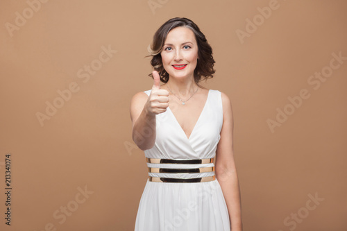 Beautiful adult woman in white dress showing like sign. Emotional expressing woman in white dress, red lips and dark curly hairstyle. Studio shot, indoor, isolated on beige or light brown background