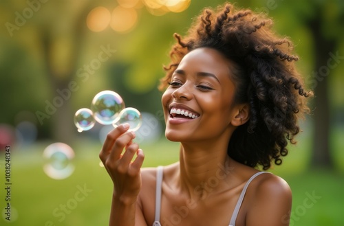 Beautiful African American woman blowing bubbles in the park. The woman is having a great time, she is happy and that is why she smiles at the camera. close-up to the waist.