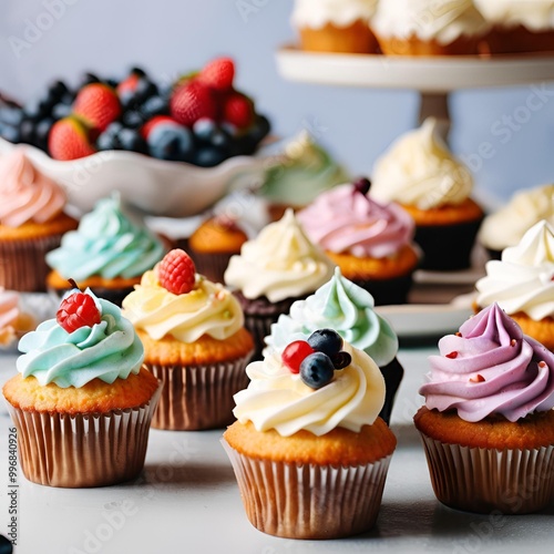 Beautiful and tasty cupcakes on the table A collection of delectable sweet treats topped with cream