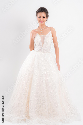 Beautiful Asian bride in a shimmering white wedding gown and necklace striking an elegant pose against at studio shot on white background.