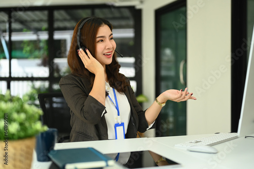 Beautiful asian female telemarketer operator wearing headset and looking at computer monitor, working in a modern office