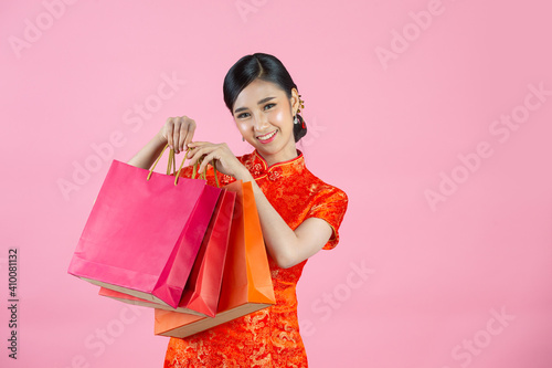 beautiful Asian woman happy smile and shopping in chinese new year on pink background.