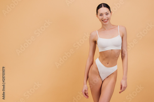 woman, asian, beauty, smiling, body, honed, shape, underclothing, white, studio, orange, background, health, wellness, fitness, diet, lifestyle, healthy, care, skin, female, girl, lady, attractive, slim, thin, weight, loss, well-being, natural, clean, fresh, hygiene, skincare, cosmetology, aesthetic, treatment, therapy, spa, salon, product, advertising, marketing, campaign, promotion, model, posing, fashion