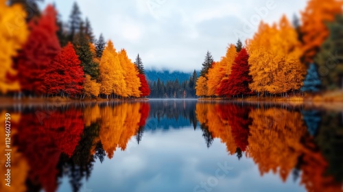 Beautiful autumn scene with a lake and trees. The trees are full of red leaves and the water is calm. The reflection of the trees in the water creates a serene and peaceful atmosphere