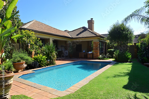 Beautiful backyard of a house with a swimming pool and a landscaped garden on a sunny day