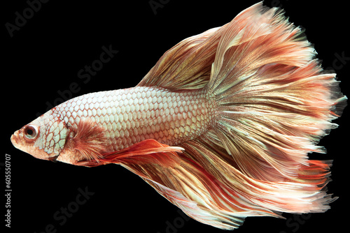 Beautiful betta fish glides through the water its vibrant colors shining brightly and creating a striking visual contrast on black background.