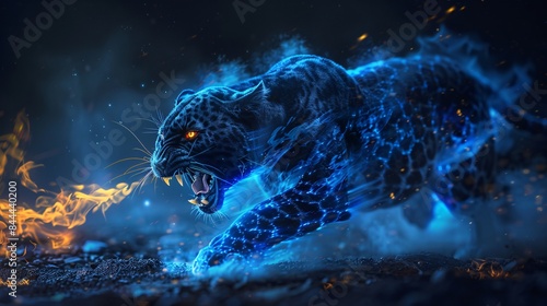 Beautiful big black leopard with fire on black background. Wildlife scene. Angry big cat in fiery ambience.