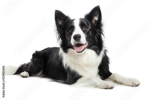 Beautiful black and white Border Collie, laying down side ways, mouth slightly open, looking towards camera, isolated on a white background , ai
