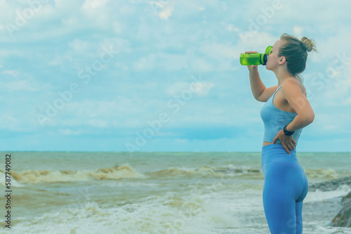 beautiful blonde sportswoman in a blue tracksuit during fitness on the seashore, drinks water from a shaker, copy space