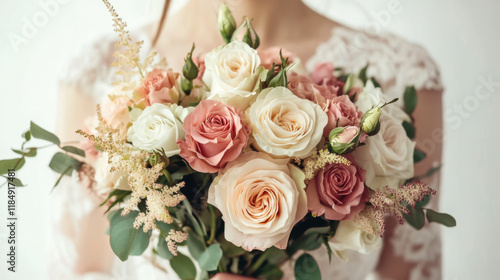 Beautiful bouquet of pink and white roses held by a bride in a delicate lace dress during a wedding ceremony
