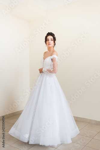 Beautiful bride wearing fashion wedding dress with feathers with luxury delight make-up and hairstyle studio indoor photo shoot