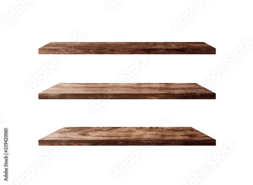 Beautiful brown wood shelves isolated on white background with copy space and clipping path for your product or design