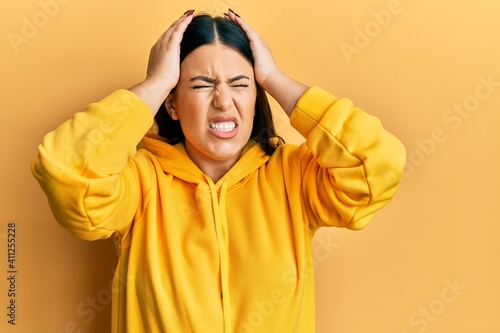 beautiful, brunette, casual attire, hand, head, cephalalgia, migraine, stress, suffering, sweatshirt, wearing, woman, ache, adult, angry, background, cool, depressed, depression, expression, face, fashion, female, girl, health, hispanic, ill, disease, latin, loud, modern, pain, person, portrait, problem, sad, sorrowful, sick, sport, sporty, stressed, style, sweater, sleepy, unhappy, yellow, young