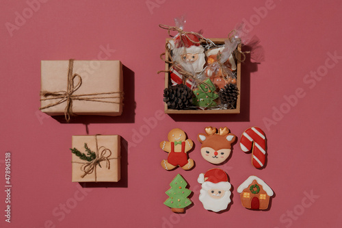 background, border, box, card, celebration, christmas, christmas tree, composition, cookie, copy space, decoration, decorative, dessert, festive, fir, food, frame, gift, gift box, gingerbread, holiday, merry, new, party, present, red, ribbon, winter, wooden