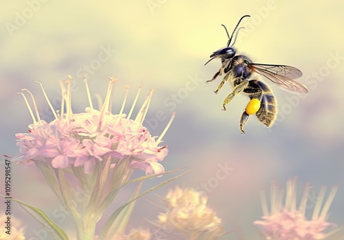 Beautiful close-up of a bee hovering near a delicate flower with soft pastel colors, capturing the essence of nature, pollination, and the harmony of wildlife in springtime