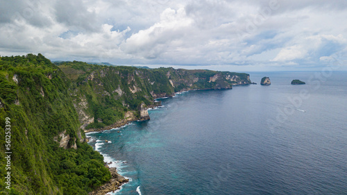 Beautiful coastline aerial view from Saren Cliff Point. Clear water and rocks with cloudy sky. Nusa Penida, Indonesia.