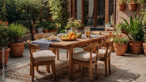 Beautiful composition of cozy terrace with big table, garden chair, plaid, plants in flowerpots, tableware, fruits in bowl, buns, brown tablecloth and personal accessories. Home decor. Template