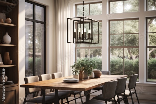 Beautiful Dining Room with Large Windows Overlooking Nature, Modern Chandelier, and Rustic Wooden Table