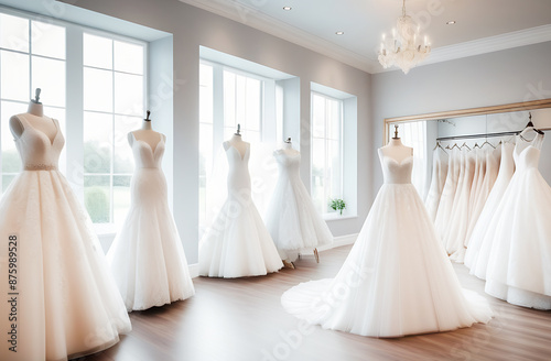 Beautiful elegant luxury bridal dress on hangers. White wedding dresses hanging on hanger in bridal shop boutique salon. Closeup