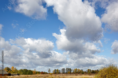 Beautiful european autumnal rural landscape. Village houses and fences against blue sky background with cumulus clouds