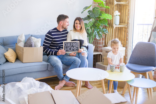 Beautiful famiily with kid sitting on the sofa holding blackboard at new home around cardboard boxes