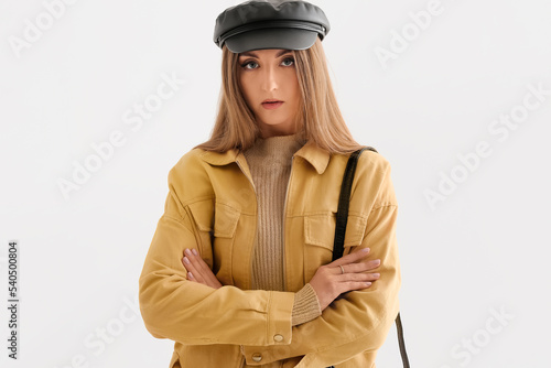 Beautiful fashionable young woman in stylish casual clothes on white background
