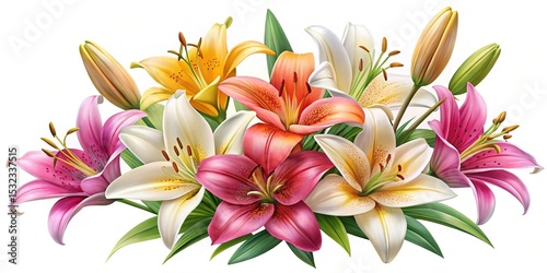 lily, lily, flower, flower, floral, arrangement, bouquet, colourful, pink, white, yellow, orange, flower petals, bloom, blooming, blossom, nature, spring, summer, garden, decoration, elegant, vibrant, decorative, floral pattern, botanical, flora, isolated, closeup, detail, stamen, pollen, leaf, green, bud