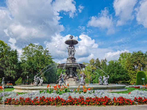 Beautiful fountain in the city park Stadtpark, a green island in the middle of the city center of Graz, Styria region, Austria. Selective focus