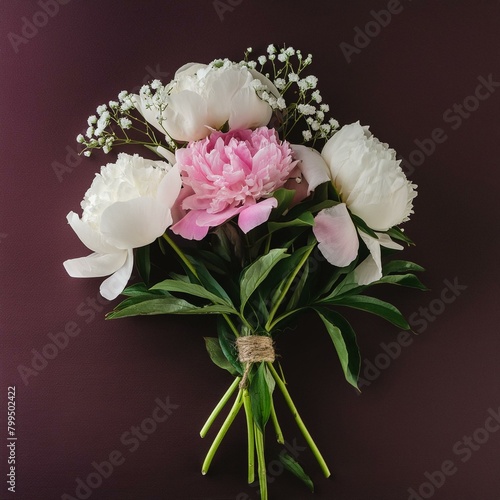 Beautiful fresh pink and white peony flowers bouquet on pink table, top view and flat lay background