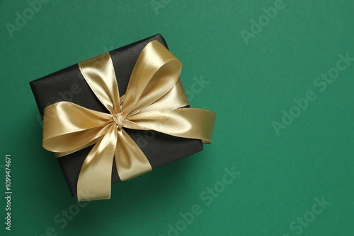 Beautiful gift box tied with bow on color background