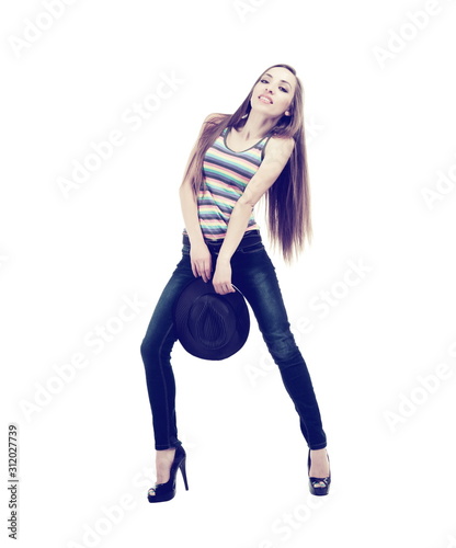 adult, attractive, background, beautiful, beauty, blond, body, casual attire, caucasian, cowboy, cowgirl, cute, fashion, female, full, girl, glamour, hair, happy, hat, isolated, jean, lady, length, long, looking, model, 1, people, person, portrait, posing, pretty, sexy, smiling, standing, studio, style, stylish, summer, western, white, woman, young
