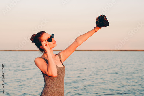 beautiful girl at sunset by the sea, takes pictures of herself on the photoport, bright emotions