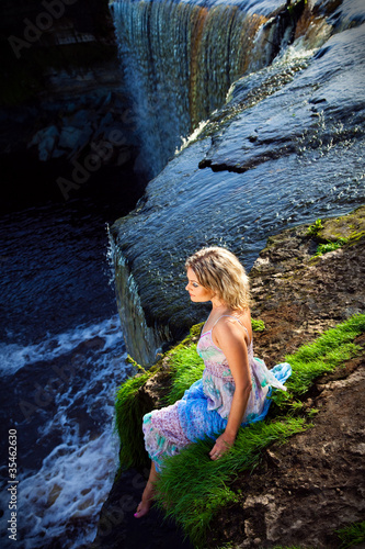 portrait, vertical, fine, graceful, lovely, beautiful, female, girl, woman, blond, fall, waterfall, sitting, brink, river, water, element, rough, fragile, strong, sundress, dress, blue, dark, violet, green, purple, nature, natural, landscape, rock, precipice, harmony, beauty, rest, enjoying, meditation, summer, sunny, silence, solitude