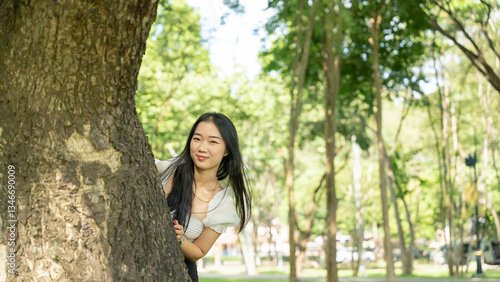 Beautiful girl peeking out from behind a tree in the park.