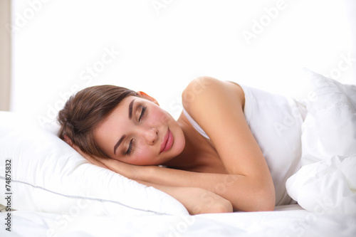 sleep, bed, bedding, pillow, comfortable, dream, girl, smile, relax, relaxation, rest, white, bedchamber, nap, face, health, sleepy, closeup, human, attractive, bedtime, calm, adult, only, light, morning, serene, people, 1, caucasian, female, woman, person, beauty, beautiful, sleepy, alone