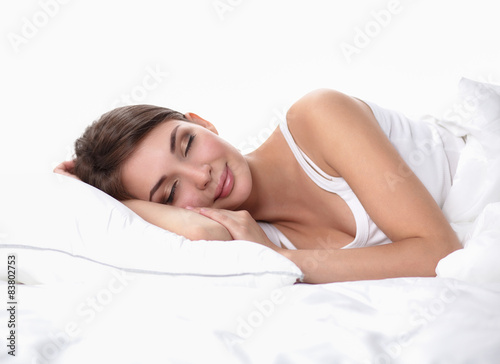 sleep, bed, bedding, pillow, comfortable, dream, girl, smile, relax, relaxation, rest, white, bedchamber, nap, face, health, sleepy, closeup, human, attractive, bedtime, calm, adult, only, light, morning, serene, people, 1, caucasian, female, woman, person, beauty, beautiful, sleepy, alone