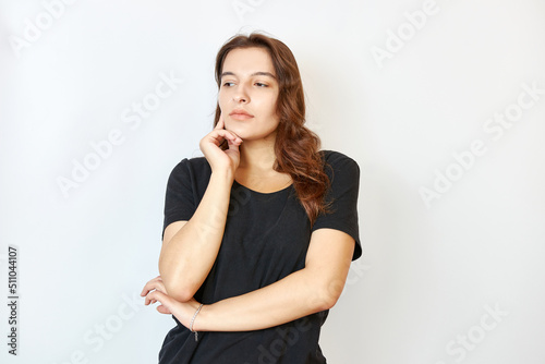 woman, beauty, mistrust, emotion, emotionless, curiosity, sorrowful, doubt, logic, business, smile, man, face, hair, studio, thinking, lady, standing, looking, friends, cute, brunette, hand, model, happiness, expression