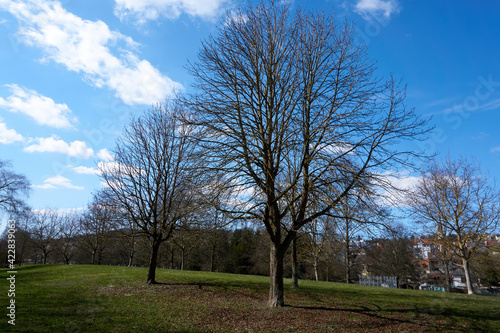 beautiful green landscape with trees under blue sky in sunshine