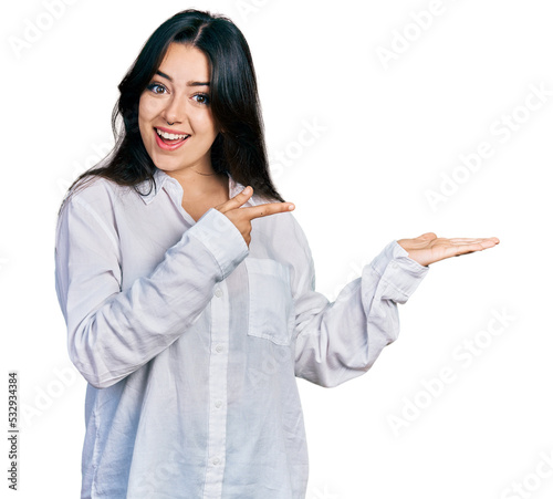 Beautiful hispanic woman wearing casual white shirt amazed and smiling to the camera while presenting with hand and pointing with finger.