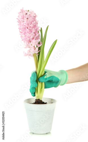 Beautiful hyacinth in flowerpot and gardener's hand (conceptual