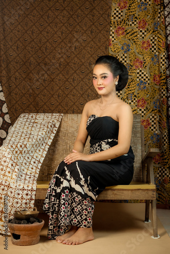 Beautiful Indonesian woman in traditional batik dress, sitting gracefully on a wooden bench. Classic cultural setting with ethnic fabric, elegant makeup, and warm expression.