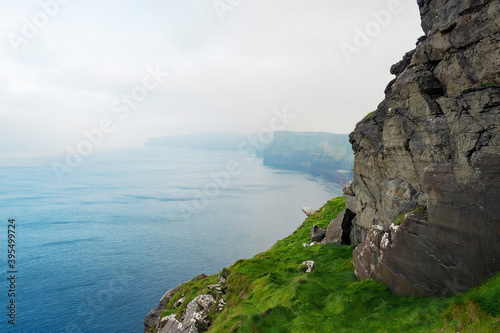 Beautiful landscape scene view on rock formations and green grass patches. Cliff of Moher, county Clare. Ireland, Popular tourist destination. Warm day, Cloudy sky, Nobody.