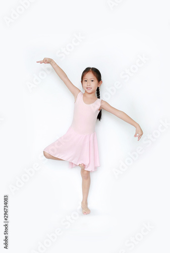 Beautiful little Asian child girl in pink tutu skirt dancing over white background. Children is studying ballet.