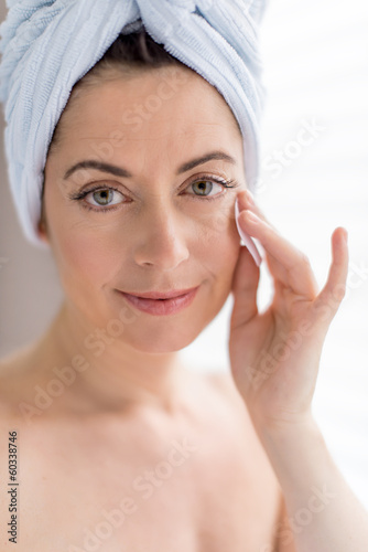 Beautiful mature lady using a cotton pad to clean her skin