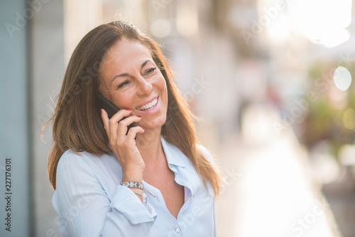 Beautiful middle age hispanic woman standing talking on the phone with smile on face at the street. Walking through the smiling confident and cheerful on a sunny day.