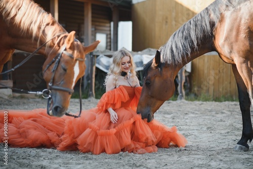 Beautiful model girl stands in a long dress with a horse