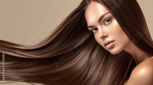 Beautiful model girl with shiny brown and straight long hair . Keratin straightening . Treatment, care and spa procedures. Smooth hairstyle